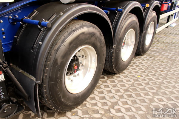 挂车轮胎采用大单胎,与欧洲挂车类似,在欧洲只要是标载情况下的物流运输,一般都采用单胎挂车。轮胎型号是425/65R22.5,品牌是双钱。