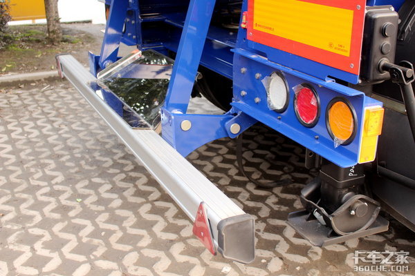 车尾保险杠以及两侧的防钻梁均采用铝合金材质,做工非常精细,样式的设计也基本与欧洲卡车一样。