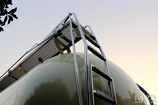 挂车尾部左侧是用来攀登到装料口的不锈钢爬梯,这款爬梯的折叠处与顶部踏板的护栏相互连接,将梯子下半段拉下,顶部的护栏也会升起,设计比较巧妙。