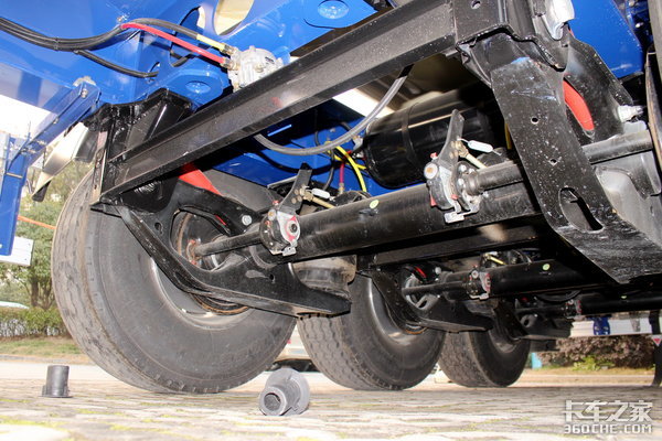 从车底下看进去,我们能够看到这台挂车采用了空气悬架,整台车的减震效果非常好,不过它的制动系统采用鼓式制动,并没有用更加高端的盘式制动器。
