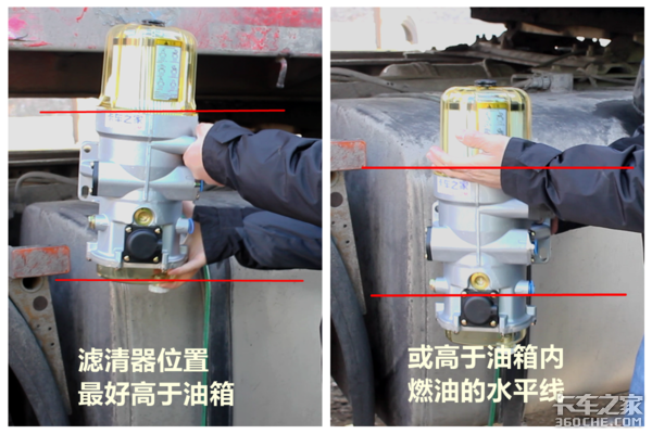 但是这种方式需要注意的是,后期再更换滤芯的时候,油箱里的燃油一定要低于滤清器的平面,否则会导致拧开罩子的时候,燃油会从滤清器中洒出来。