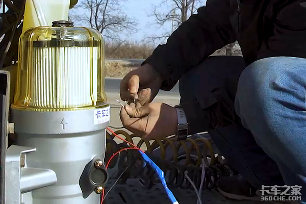 红线连接好之后,将黑色线缆直接接到车架即可,这样整套电路线缆就安装完成了。用防水胶带将接口部分粘好,并将所有的线速进行整理和捆扎。这样,我们就将亿利大炮完整的装到了卡车上。