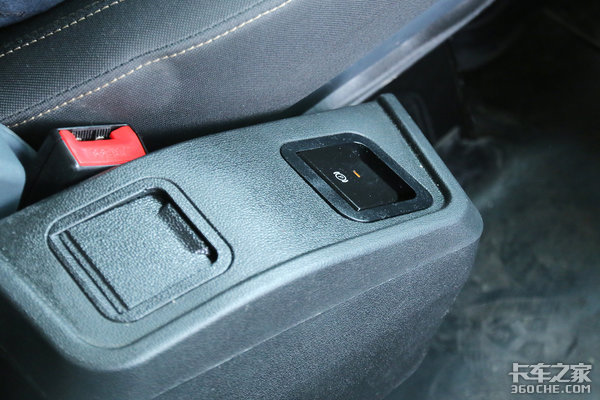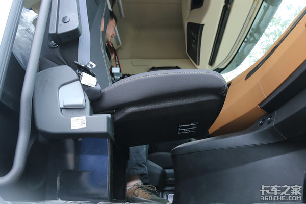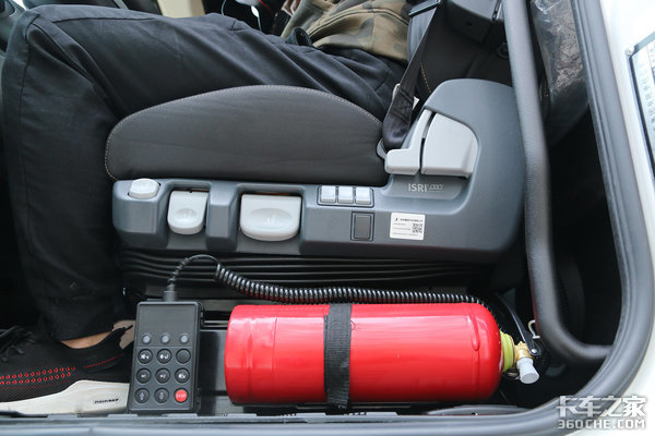 打开车门,最先看到的是伊思灵豪森(ISRI)的气囊减震座椅,从前往后分别是快速放气、软硬度、座椅高低、腰部支撑、背部支撑的调节按键。一体式的安全带和右侧的扶手设计,也是国内重卡的标配项目,座椅下方为车桥的气囊高度调节。