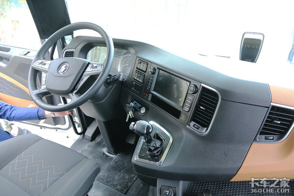 右侧是定速巡航和辅助制动系统的控制手柄,设置好车速,双脚完全解放出来,车辆的发动机、变速箱会根据你设置的巡航速度自动控制车速。哪怕是在下坡的路段,变速箱和辅助制动系统也会自动介入,来自动控制车速。