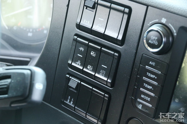 仪表盘的右侧是控制按键区域,从上往下总共有三排,分别是差速锁、驾驶室后照灯;挂车制动检查和驻车制动、车辆气囊高度调节以及自动驾驶开启/关闭;下方则为无人驾驶的开启按键。
