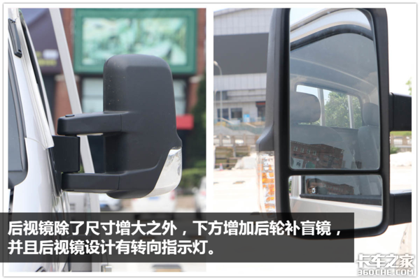 与我们常见小轻卡车型不同的是长安跨越王X5Plus增大了后视镜尺寸,另外增加一块观察区域,可直接观测后轮的位置情况。