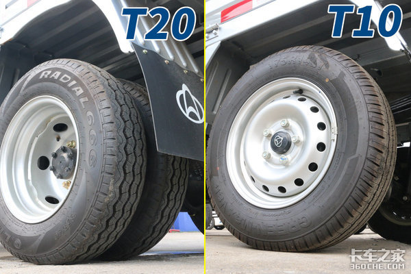 除了上述的设计以外,两台车的轮胎差异也很明显。T20是后双胎设计,轮胎规格185R14LT,承载能力不俗;T10是后单胎设计,轮胎规格175R14LT,承载性能虽逊色于前者,但也符合产品设计和定位。