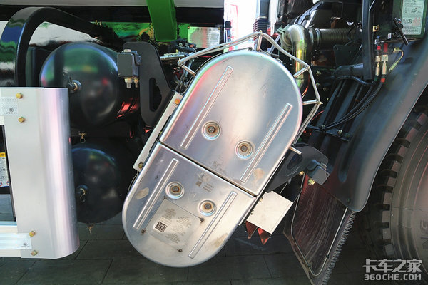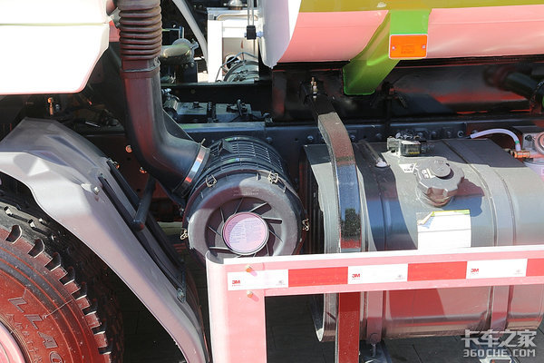 车架右侧集合了国六后处理系统、储气罐、电瓶、尿素罐以及干燥罐,凭借它大尺寸的后处理,我们从外观上一眼就能看出它是一台国六车型,对于这样一台需要长时间在城市中作业的车型,国六排放无疑是最好的选择。