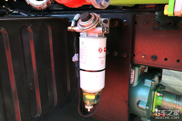 车架左侧集合了空滤、油箱、柴油粗虑器以及水阀开关,由于它的运输里程不是很长,与我们平时所见的中卡车型稍有不同,所以一个小油箱已完全够用。