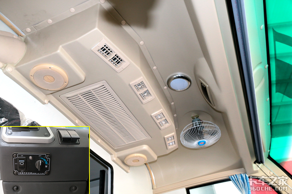 驾驶舱的顶部为车载空调,并且主驾一侧还单独配上了一个小电扇,能够很好地提升驾驶的舒适性。