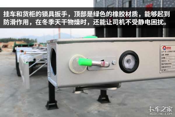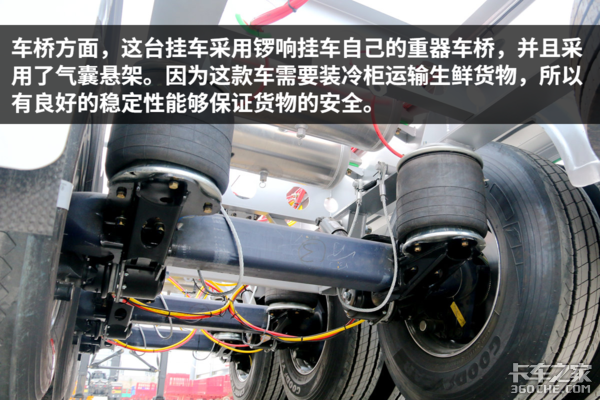 事实上,骨架挂车在国内还有另一种用途,那就是装上冷柜来跑冷链运输,这种组装起来的冷藏车和专用冷藏挂车一样,要经受长途、高速、多重路况的考验。今天我们说的这台挂车就是用来拉冷柜的骨架车,配置也是相当高。