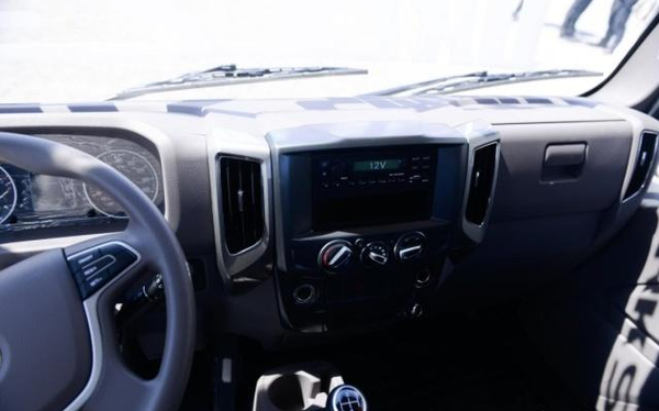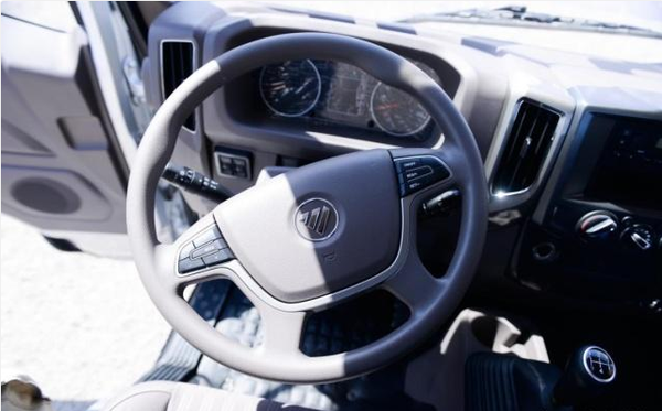 由于驾驶室采用窄体设计,中控台上的功能按钮全部集成到了方向盘上面。特别是右侧的定速巡航控制,在方向盘上就可以操作,特别方便。