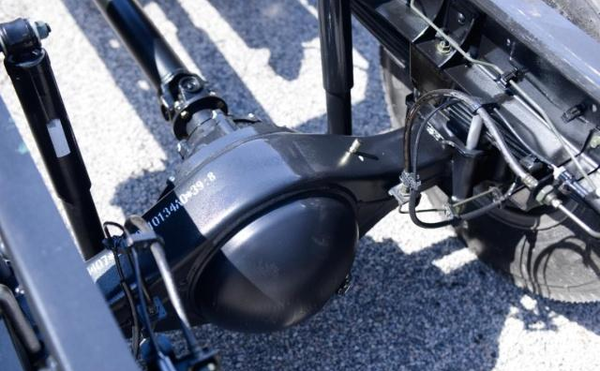 后桥主减速比为4.875,没有安装横向稳定杆。该车采用了液压制动器,液压制动和气压制动相比制动力较小,但是制动非常灵敏。这也是按照用户使用的情况来配置,城市配送肯定都是标载,标载情况下采用液压制动,制动效果灵敏且制动速度快,另一方面频繁制动不需要担心气压不足的情况出现,高效且保险。