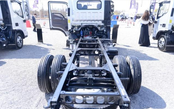 城配之星和其他车型最大差别就在于其车架部分,前桥采用了2.5吨级别转向桥,轮距为1.445米;后桥则采用了4.5吨的车桥,轮距为1.425米;全车采用了尺寸为7.00R16的子午胎。由此可见,城配之星的底盘尺寸较小,专为标载运输打造,如果强制重载运输的话很有可能会出现重心不稳的现象。