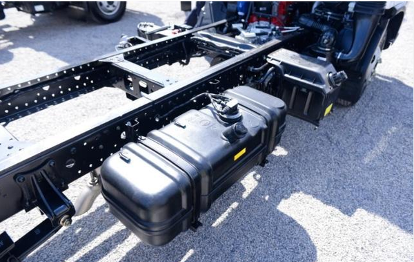 而车架的右侧也与传统的欧马可车型布局差不多,油箱、尿素壶、空滤全安装在这个区域。塑制油箱的容积差不多在100L,基本能够满足该车的综合运输情况。