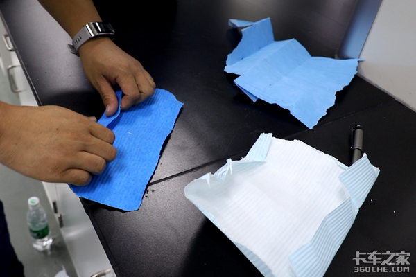 对三款滤清器的滤纸进行取样,将有纳米涂层的一面当作碗底折成纸碗形状,并向纸碗中倒入清水,看看三款纳米滤纸是否真防水,在水泡之后强度怎么样!