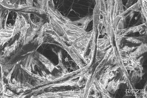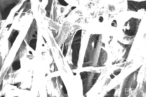 首先是金亿利的纳米空滤未经过揉搓的显微镜照片,能够清晰地看到大量类似于蜘蛛网的纳米涂层,结构很强且密度较高。