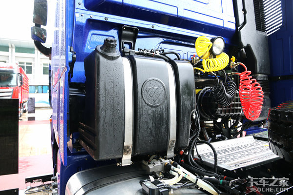这辆EST穿越版定位高端长途物流,车身两侧布局都尽量为油箱腾出空间,占用了尿素罐位置,不过不用担心,尿素罐被移到了驾驶室后侧,并增大了容积,通过观察推测这款5XL版的尿素罐容量应该在80L左右,满足长续航车辆对尿素使用量的需求。