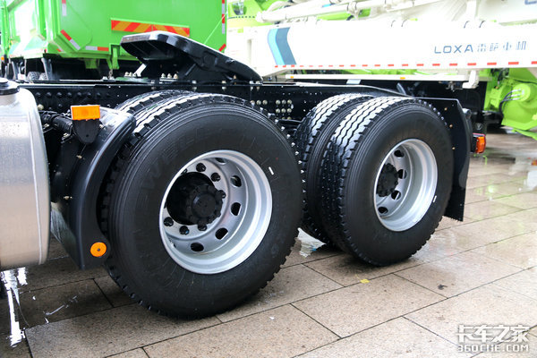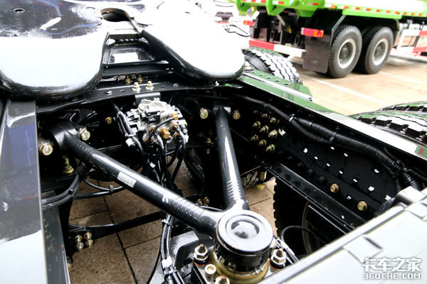 后桥来自青特,速比2.714,较小速比能保证车辆的时效性,并且为10万公里长保养。直接挡变速箱+小速比后桥是欧洲重卡惯用的搭配,通过简单计算,这辆车在发动机1100转时,车速可以达到80Km/h,在发动机1300转时可以跑到94Km/h,不超速的情况下能够保证低转速高车速,节油高效!