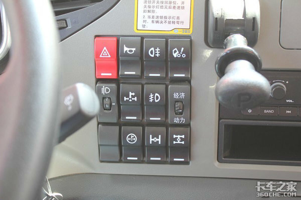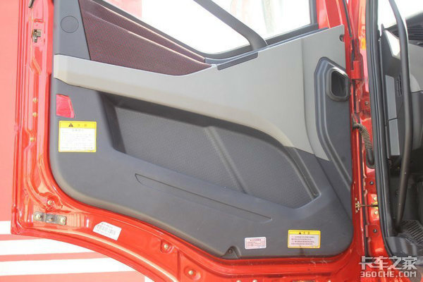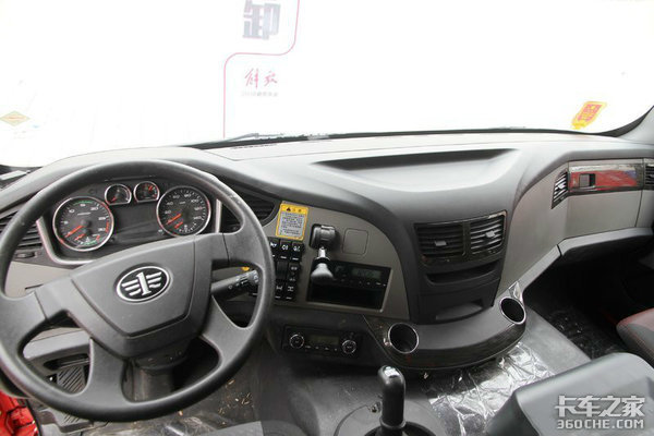 标配带多向调节的气囊减震座椅,电动门窗,方向盘为解放最普通的四幅方向盘,方向盘右侧的功能键依次是双闪灯,电气喇叭转换,后雾灯,大灯高度调节,取力器控制前雾灯,节油开关,轮间差速锁和轴间差速锁,原车标配两个24V120W车载电源。