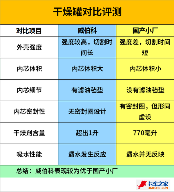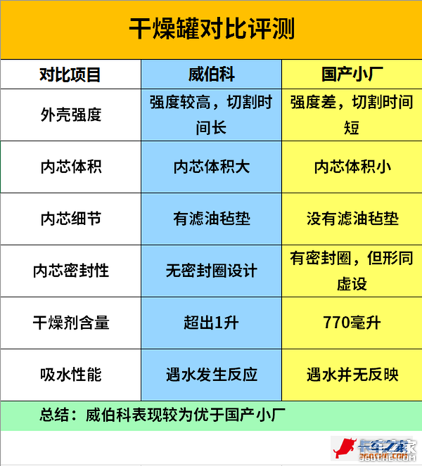 在这也给各位卡友进行一个表格对比,能够更直观的看出两款空气干燥罐的具体区别。