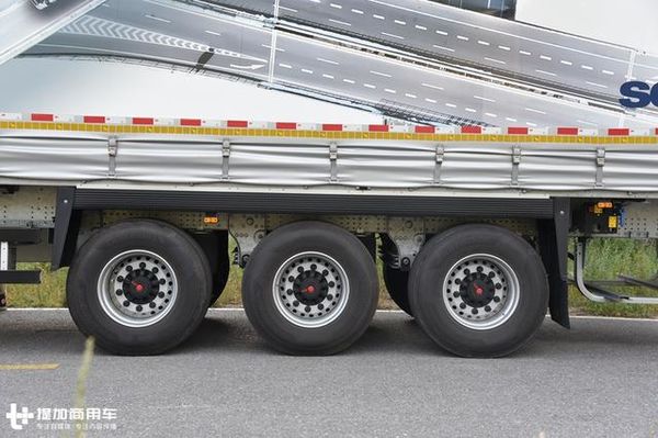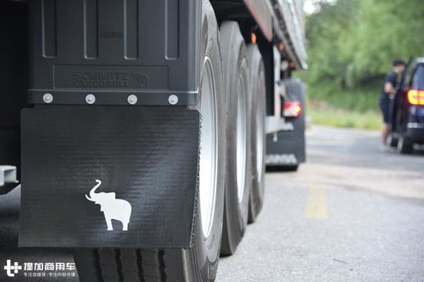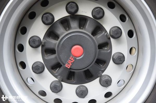 轮胎采用的是385/65R22.5的大单胎,具有滚阻低,成本低等优点。我们知道大单胎在欧洲比较流行,但这主要是建立在两个基础条件之上,不超载和路况好。