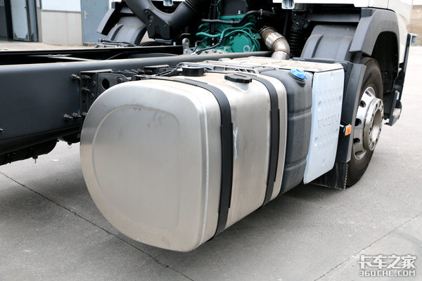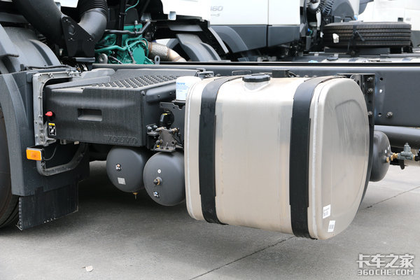 车架右侧,有一个跟左侧一样大的D型油箱,紧挨着油箱的是尿素罐和后处理系统。