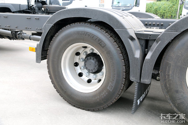 轮胎则是沃尔沃FM牵引车一样,采用米其林品牌的295/80R22.5型号真空胎,驱动桥胎面采用麻将块,以保证轮胎摩擦力。