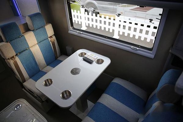 内饰方面,这款车也是一改皮卡房车略显沉重的风格,浅蓝色和白色的搭配,更具活力,带着轻松的乡村风情。