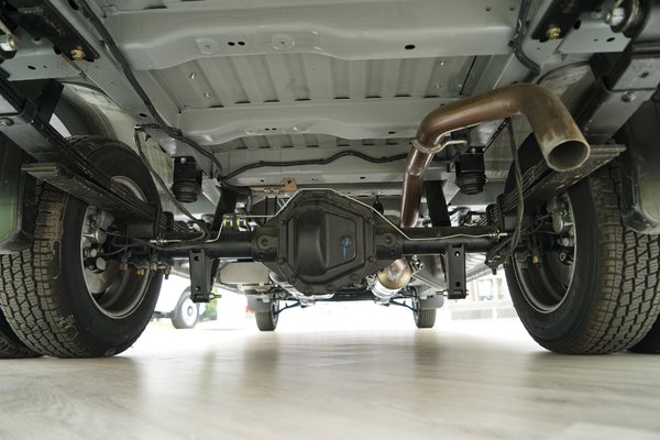 在后桥可以看到,后桥采用了少片簧、速比为2.5的整体桥,吨位为3吨,同时还带有2支粗壮的减振器,这在一定程度上也增加车辆的舒适性。