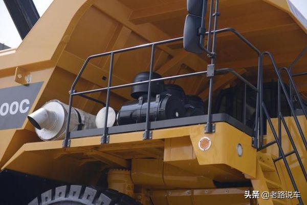 DR100C采用了单边驾驶室,驾驶员从发动机进气格栅左右两边的楼梯上到平台,通过平台进入驾驶室。在平台上面设置了非常多的扶手和栏杆,毕竟平台离地面有将近三米的距离。该车没有设置车灯,主要也是考虑到矿山工作环境都比较明亮。