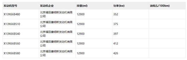 福田康明斯X13排量12.9L,最大可输出580马力,最大扭矩2600N.m,从950-1500rm均可输出最大扭矩。后处理采用DOC+DPF+SCR,可直接满足国六b排放要求。