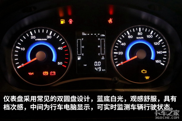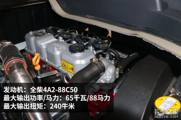 实拍车辆搭载全柴4A2-88C50柴油发动机,排量2.3升,最大输出功率88马力,最大输出扭矩240牛米,满足国五排放标准。柴油机较大的输出扭矩,为车辆爬坡、超车提供了足够的爆发力,适合对动力需求较大的用户。