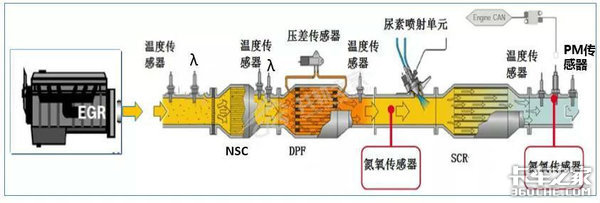 小贴士:国六车后处理系统比国五/国四车配置更多的排温传感器,配置了上游氮氧传感器测量原排的氮氧含量,实时的修正尿素喷射量,还配置了PM颗粒物传感器监控尾气中颗粒物是否合格。