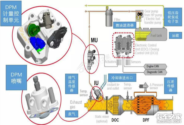 DPM系统主要是通过向排气管中喷射燃油,使燃油在排气管中燃烧,以提高排气管中废气的温度,进而达到DPF的目标温度(600℃),使主动再生可以顺利进行。