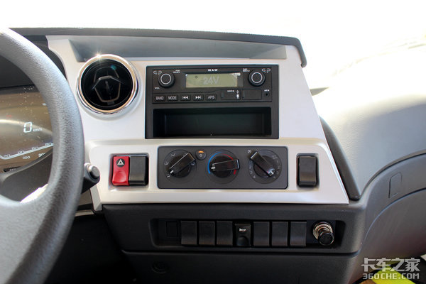 中控台的控制区域倾向于主驾驶一侧,空调出风口采用镀铬材质,面板则是银色装饰,挺有质感的。最上面是多媒体控制区域和储物槽,下面则是危险报警灯和手动空调控制区域,最下面是电气喇叭转换和点烟器。