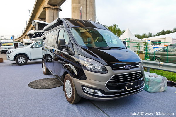 这款房车是景宴基于新全顺底盘改装的一款B型房车,外观采用的是战斗黑的颜色,看上去更加犀利有神。车头处带有福特的标识,这要比大通、依维柯更加具有知名度,开出去也比较提升档次感。