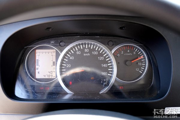 仪表使用三联表,最右侧配备了橙色的显示屏,显示信息也较为新颖,转速表、油量显示、尿素量显示、以及水温表都集成在显示屏上。