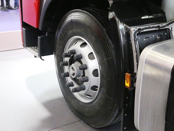 这辆天龙KL为6×4驱动,共6胎位10条轮胎,轮圈由10个螺栓进行固定。轮端采用了康迈轮端,具有超长的维护周期。轮胎型号为12R22.5的真空胎。