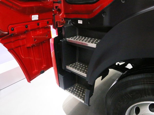 打开车门,天龙KL采用三级蹬车台阶设计,从下至上逐步变宽。台阶均有做了防滑设计,下两级台阶还有镂空偷轻设计,减轻了质量,也不易存水。