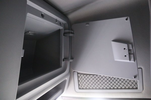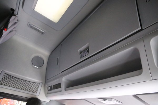 作为高顶双卧卡车,车内储物空间非常充裕。驾驶员的头顶,分布着数个大小不一的储物盒,上方较大的储物格还带有盖板。下方开放式储物格外延有小挡板,避免车轮上坡时东西滑出。