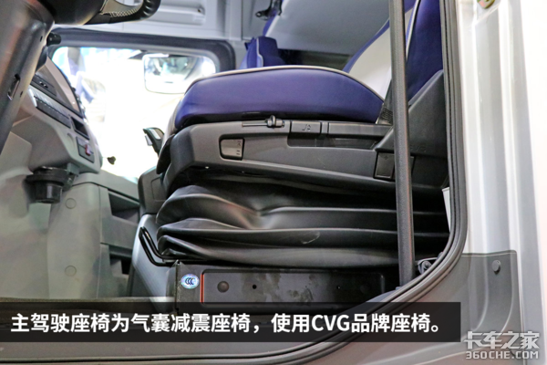 气囊减震座椅带有座椅俯仰度调节、一键放气、座椅支撑软硬度调节、上下调节、靠背调节和2级腰部支撑调节,保证驾驶员的乘坐舒适性。