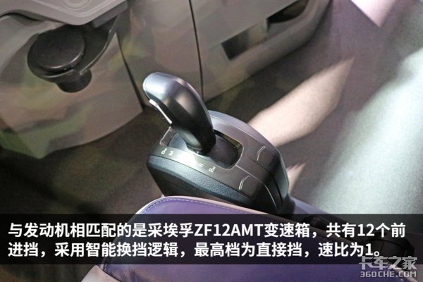 采埃孚的TraXon AMT 12挡变速箱采用智能换挡逻辑,带有GPS预换挡功能,能自动获得最佳的换挡时机,有效减少在山路、弯道路况下的换挡次数,帮助降低油耗,大大提升驾驶舒适性和车辆驾驶性能,据了解其传动效率达到了99.7%,带有采埃孚液力缓速器,使安全系数进一步提高。
