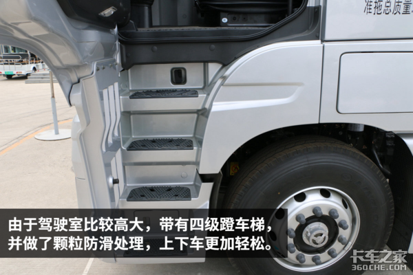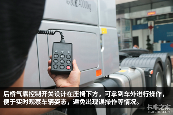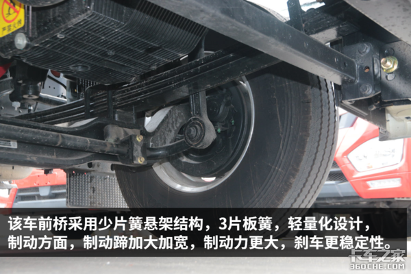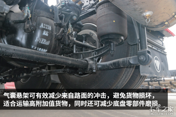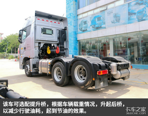 该车可选配提升桥,支持后桥提升,可在空车的时候升起后桥,减少行驶阻力,降低油耗,同时还可以降低轮胎的磨损,减少车辆的负担。载货时把它放下,起到更强的承载作用。
