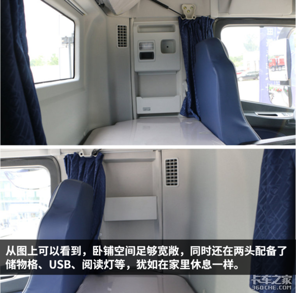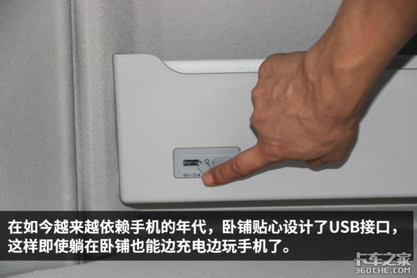 卧铺将直接关系到休息的质量。体验之后,这款卧铺最爽之处不仅是软硬适中的床垫,更爽的是还配备了USB接口。对于开了一天车的司机来说,任何一点减少“麻烦”的设计,都绝对是加分项,躺着也能用手机,何乐而不为呢?