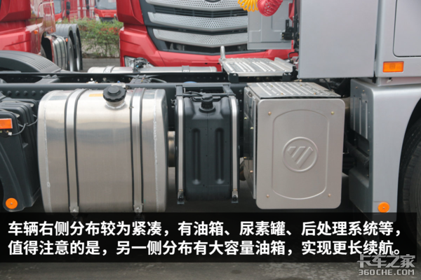 车辆两侧分别配备了一大一小两个铝合金油箱,满足了长途公路运输所需。同时还可加注两种不同标号的柴油,在不同温度环境下,切换使用。冬季点火烤油箱?再也不用了。