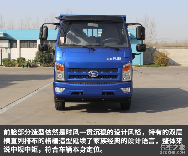 ● 点评:看得出来,时风风顺单排自卸车的外观设计还是非常用心。作为偏向复杂路况使用的车型,没有过多冗杂的设计,一切都向着实用性靠拢,给人一种厚实,可靠的感觉。此外,三米二的车身可以无忧上蓝牌,路权相较黄牌货车将更加宽泛。