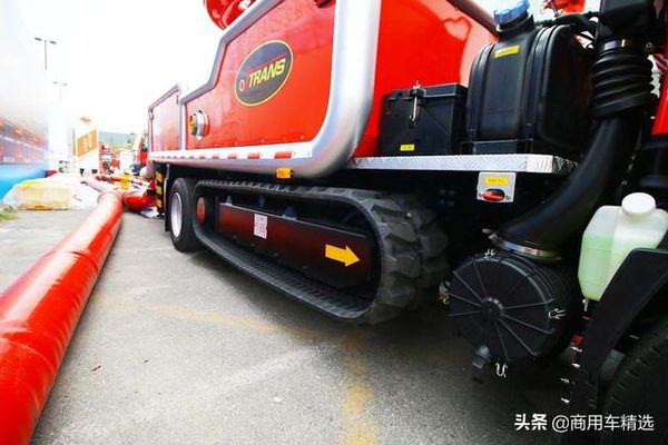 在10月中旬举行的2019北京消防展苏州捷达的室外展台上,有一辆庆铃700P消防车相当独特。在底盘两侧各安装了一副履带,看起来气势十足,它其实是苏州捷达化工消防编组中离火场最近的一辆消防车之一。
