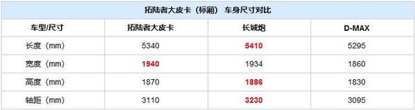 作为一款皮卡车型,货厢尺寸的大小对其装载能力有着直接影响。拓陆者大皮卡的货厢尺寸为1520×1580×440mm,其在货厢宽度上领先于竞品车型(例如长城炮),但在货厢高度上就逊色些。