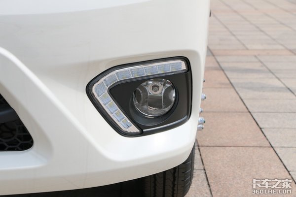 菱形组合式大灯集成设计了远近光灯,大灯调节按键位于驾驶室内部,比较独特的设计在于LED日行灯和雾灯一起布置在下方,着车后会自动点亮。